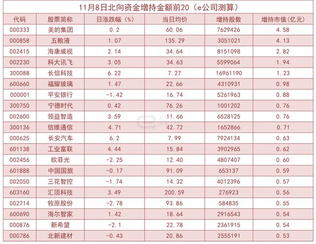 统计数据显示,11月8日北向资金合计净流入13.69亿元。其中沪股通净流出6.06亿元,深股通净流入19.75亿元。北向资金成交金额达到392.83亿元,占A股当日总成交金额比重为8.74%。
