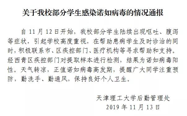 新京报快讯 11月13日,天津理工大学通过其官方微信发布关于该校部分学生感染诺如病毒的情况通报。