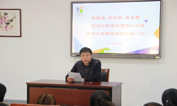 为深入贯彻落实大兴区教育大会精神,明确立德树人根本任务,努力将大会精神学习好、宣传好、贯彻好、落实好,2019年12月2日,团河小学召开全体教师会,以“精解读 明方向 促发展”为主题学习宣传全区教育大会精神。