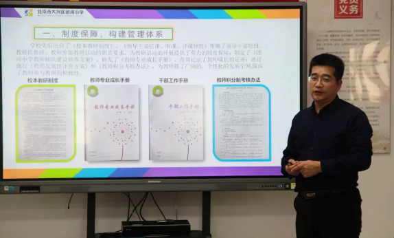 在验收工作中,李兵主任以《创新校本教研思路 助力学校内涵发展》为题,围绕学校校本教研的制度建设、组织建设、教研活动开展情况及取得的效果等内容向验收组做了具体介绍。