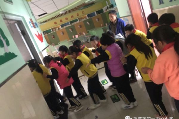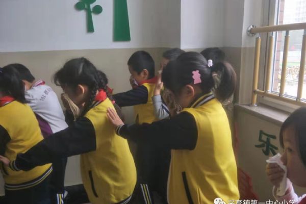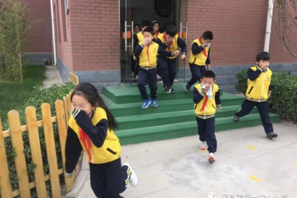 上午9:40分,在警报响起、撤离信号发出之后,全校学生按照老师的指挥,掩住口鼻,弯腰前行,有序撤离到操场。接着进行站队、清点人数、汇报情况等环节,整个演习井井有条。
