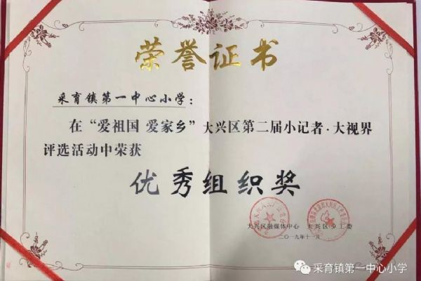 2019年11月6日下午,大兴区少工委和大兴融媒体联合举办的“大兴区第二届小记者大视界颁奖典礼”在大兴二小隆重举行。采育一小大队辅导员王脉斌老师带领纪嫣倩、张梓涵、解语三名“红通社”小记者参与了本次活动。