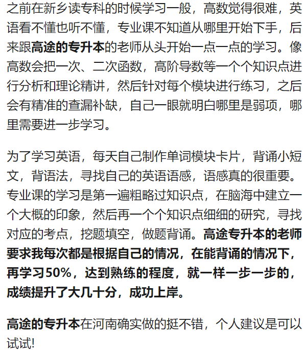 现在专升本的人数越来越多了,考试难度也在增加,如果有不知道怎样备考的话,或者担心自己单独备考不行的话,真心建议可以跟一个班,我当时报的是高途专升本,老师讲解耐心细致,会根据自己的学习情况来帮你做考试规划!