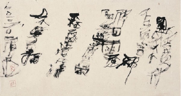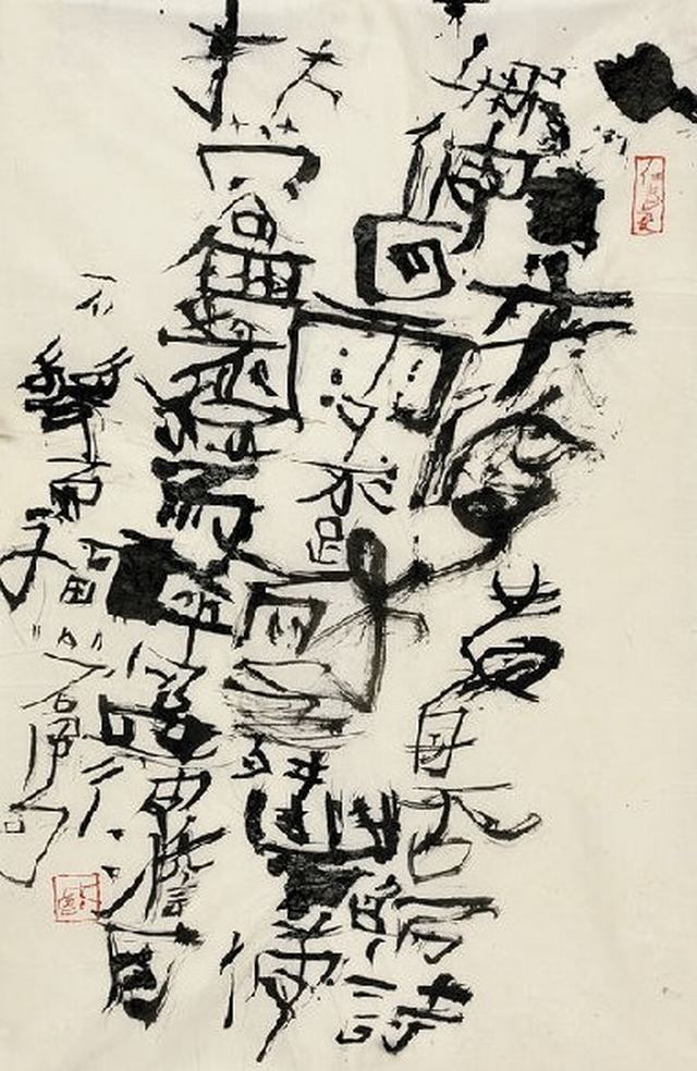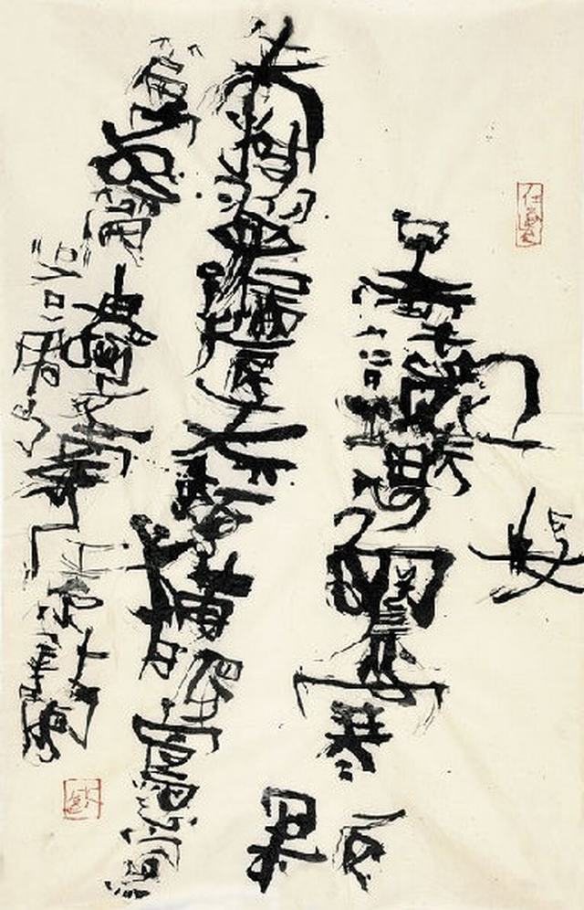我们不得不承认,在石虎所有的作品里,他对于文字的解构手段是非常独到的,且大胆,甚至于“妄为”,这是由他的艺术气质所决定的,出自于他笔下的字形结构会出奇的诡谲多变,千态万状,在“口婴”、“菊问”、“穹思”等作品里,通常都会出现字形叠加的形态,有线条浓淡和虚实的叠加,有字形参差的叠加,也有为追求构图大块的疏密对比施以的结构多重叠加,也有字与字之间结构的互相嵌入、穿插、挪让等,但又不是一种简单的形式累加,而是合理的布白中将整个字形的离奇变化,与整个章法的空间形态相呼应,构成了多度空间的书法意味,大格局下,又不忘叠加后的线条或虚实之间有精微之处,这样就有了细节的笔墨变化和意蕴的滋生,在大尺度的错落中,隐藏着是奇态无比,又耐人寻味的生涩与古奥 ,仿佛散发着浓烈的悠远意境,石虎用它他最朴素,又最能凸显视觉张力的方法告诉我们,书法是可以这样写的,艺术情感是可以通过这种无比想象的的方式来释放。看似烂漫真率,却是惨淡经营,而无丝毫造作之嫌;看似放浪不拘,却是孤标独步,而无任何涂鸦之意,无论是“朵云”离奇结构的变幻和“穹思”虚幻飘渺的空灵,还是“其格”如天马脱衔般的飞扬,或“菊问”的粗头乱服,都可以看出,石虎书法在汉字的表现性上有着常人少有的灵性和胆识,前者是天赋,后者是实现天赋的内在强大支撑,艺不压身的他可以毫无顾忌地任意表现笔墨情趣,层层的去探视多重构成元素在现代书法中的运用,常以非理性的行为模式,来完成作品的创作,富有灵性和智慧的表现性,是石虎书法游离于传统书法常态的根本,成为一种不可复制性,不可侵犯性的标识,在其作品里,字法的解构充斥着不可思议的玄机,营造了近乎于虚幻、迷离、难以捉摸的视觉影像,甚至文字的不可释读性,而这正是石虎书法总体上给人以另类感觉之所在,然石虎似乎并没有故意去强化这种虚幻影像的高深难解,他想要表达最本质,最原始真趣的艺术感觉。
