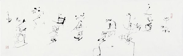 在石虎作品中,夸张和变形的手法是其运用最多,也是最突出的行为模式,这一核心手段可以说是贯穿现代书法中最本质的表现语言,石虎不能例外,且有“变本加厉”之势,如果为夸张而夸张,为变形而变形,就显得不智慧了,这不是石虎,我们相信他可以找出很多条理由来诠释这种手法的合理性,但关键还是在于他对传统书法书写模式的反思所作的骇俗之举,是其内心自我审美需求和情感的自然反应,强化构图的现代意识,拉开了与传统书写的形式距离,凸显原始的,本能的,带有几许旷野的味道。于是,我们看到的是一种“忽作风驰如电掣,更点飞花兼散雪”(王邕句)的书法景象,宏肆壮阔,强调作品的视觉构成性和内在的生命图象,挥洒之中的强势秉性与图式的烂漫抒情性,高度统一在刚柔相济、变化多端的线条和充满虚幻意识的语境中,给人以遐想或幽思,赋于以作品更多的现代审美意念,最大限度的展示当代书法语境的多元性和时代性。