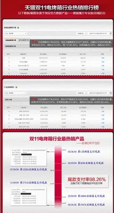 淘宝最新数据显示,双11电烤箱销售额3974万元,长帝销售额达到2091万元,占淘宝总体的52.63%;长帝销售额同比增长了200%;销售量5.1万台,占淘宝总体的51.7%。长帝电烤箱无论是销售额还是销售量都已占据双11电烤箱的半壁江山。