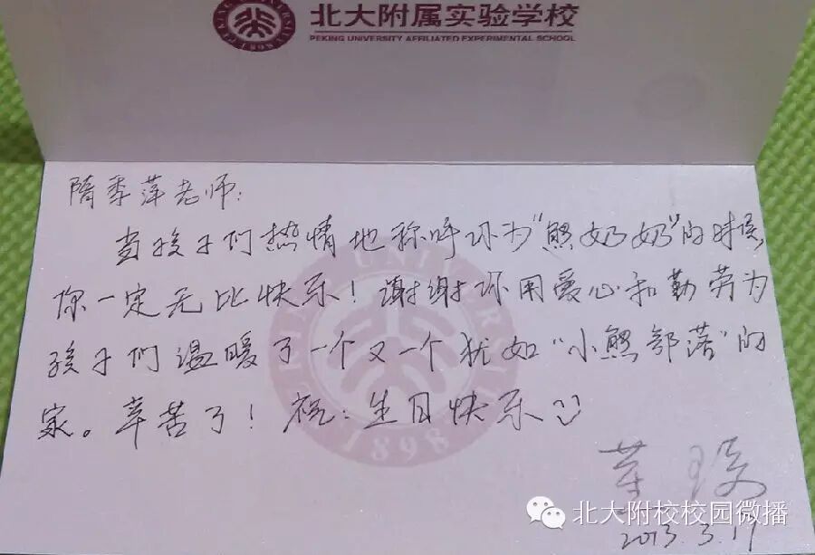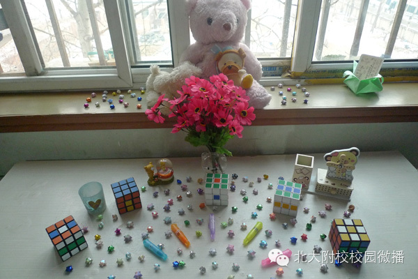 记得2012年冬天,我们走进隋老师管理的宿舍,初二(3)班女生(410)宿舍“小熊部落”的同学们折了六只小船挂在窗户上,每只小船上放着一张小卡片分别写着自己可爱的小熊名字:安妮熊、侯雨熊、Smile熊、爱琳熊、梦萌熊、哈米熊。生活老师隋季萍高兴地介绍:“就因为这个,孩子们每天都称呼我为‘熊奶奶’,呵呵……”