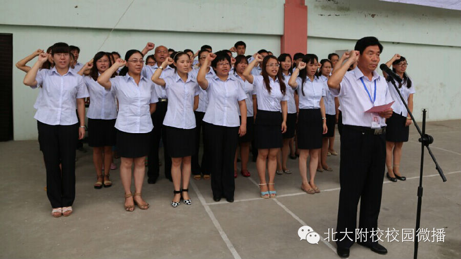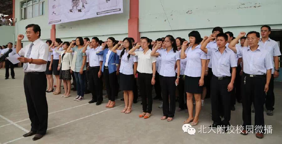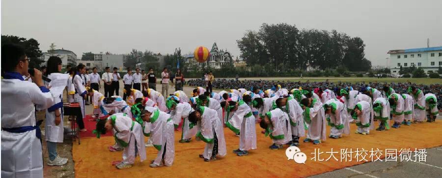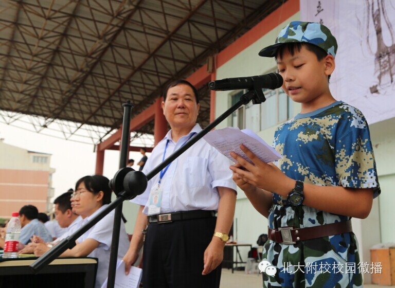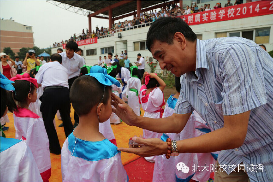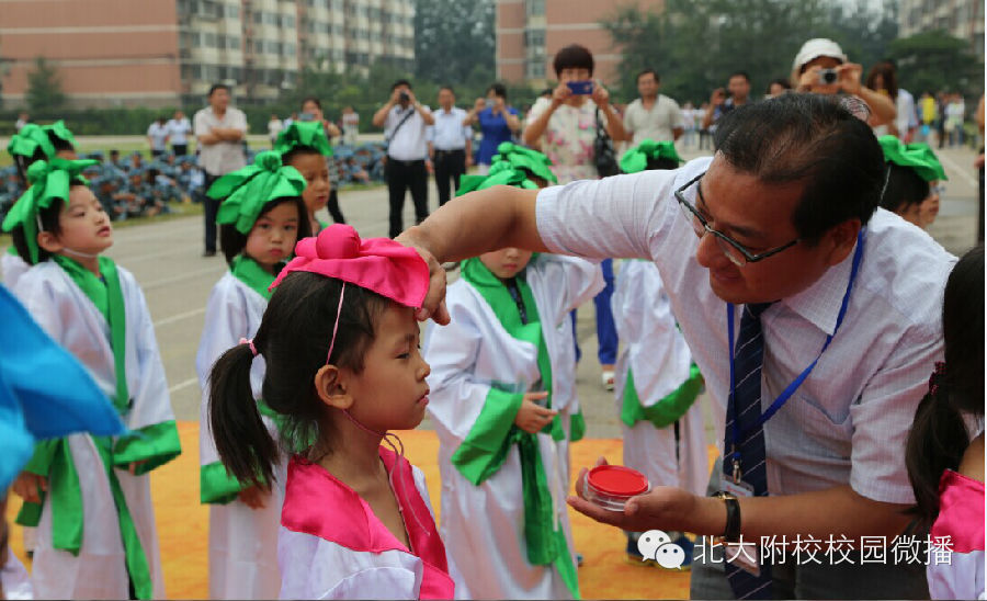 开学典礼上,在教职工与学生的庄严宣誓之后,我校迎来了小一新生童子入泮仪式。首先,司仪做开场明礼,介绍入泮仪式的历史渊源与活动的现实意义。泮,是周朝学校前半圆形的水池,名为“泮池”,古代学生入学即谓“入泮”。入泮在中国古代是隆重的入学大礼,就跟束发一样是人生的第一次礼仪。之前可以是顽童,入泮之后就意味着要开始接受圣贤的教育,做一个有品德的人。我校举行小学新生入泮典礼,意在彰显经典文化的魅力,倡导尊敬师长的美好风尚。入泮仪式正式开始后,先后进行正衣冠、盥洗净手、行拜师长礼,朱砂启智,开笔启蒙,吟诵经典几个步骤。所谓“先正衣冠,后明事理”;盥洗净手,从此用勤劳的双手打开知识的大门;行拜师长礼,拜孔子,拜老师,拜父母;朱砂启智,校领导和嘉宾分别为学生在眉心点上朱砂,为孩子开启智慧、目明心亮,让孩子更好地学习知识和学习做人;开笔启蒙,由教师向学童授笔,并教授握笔执笔方法,学生书写人生的第一笔;吟诵经典,教师带领全体学生齐声诵读国学经典。入泮,作为孩子们人生的一课,诵读国学经典,弘扬传统文化,誓做有德之人。一如学生宣誓“我是中国少年,我爱我们的祖国;我是北大附属实验学校的学生,我爱我们的学校,尊敬我们的师长;我立志修身立德,我勤奋刻苦学习;用我们的努力,赢得老师的微笑,父母的欢乐;我们崇尚科学,我们追求进步;时刻准备着,为中华民族的复兴;时刻准备着,为祖国的富强贡献力量!”