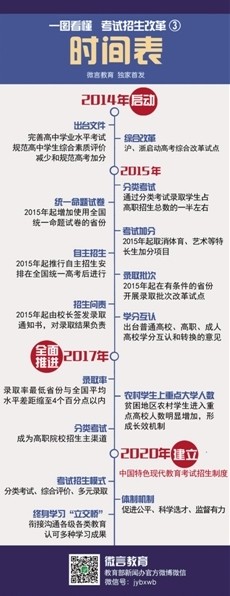 《意见》要求,要改革考试形式和内容,完善高中学业水平考试,规范高中学生综合素质评价。2014年要出台完善高中学业水平考试和规范高中学生综合素质评价的指导意见。要加快推进高职院校分类考试,2015年通过分类考试录取的学生占高职院校招生总数的一半左右,2017年成为主渠道。深化高考考试内容改革,从2015年起,增加使用全国统一命题试卷的省份。
