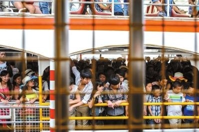景区“超载” 10月2日,福建省厦门市,下午4点半,从鼓浪屿回到厦门岛的游客挤满了轮渡。厦门市共动用23艘载客量600人的轮渡应对人潮,每艘轮渡,相当于15辆大巴车的载客量。当日游客量达7.9万,远超过该景区6万游客承载量。图/CFP