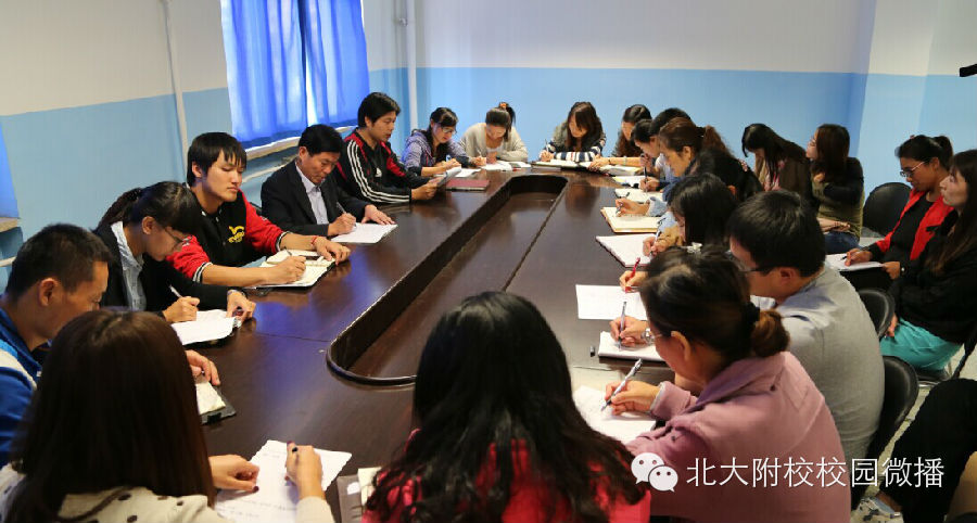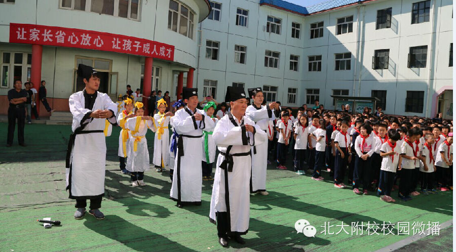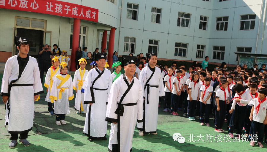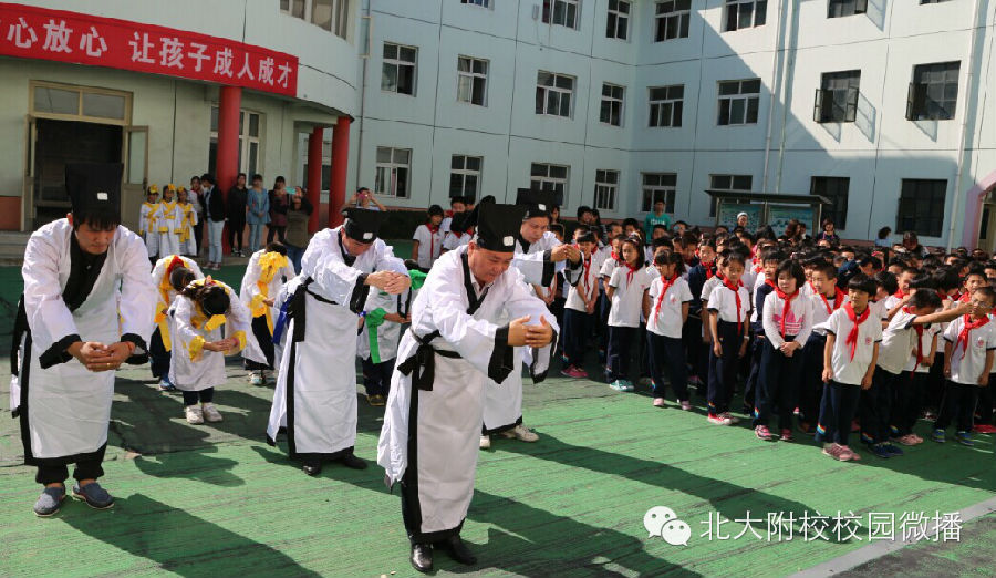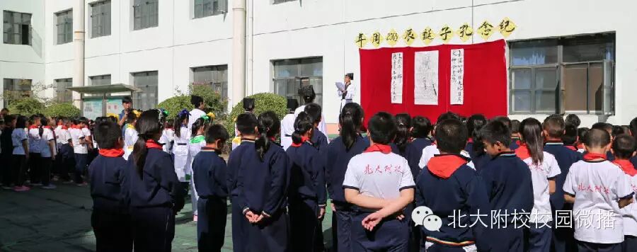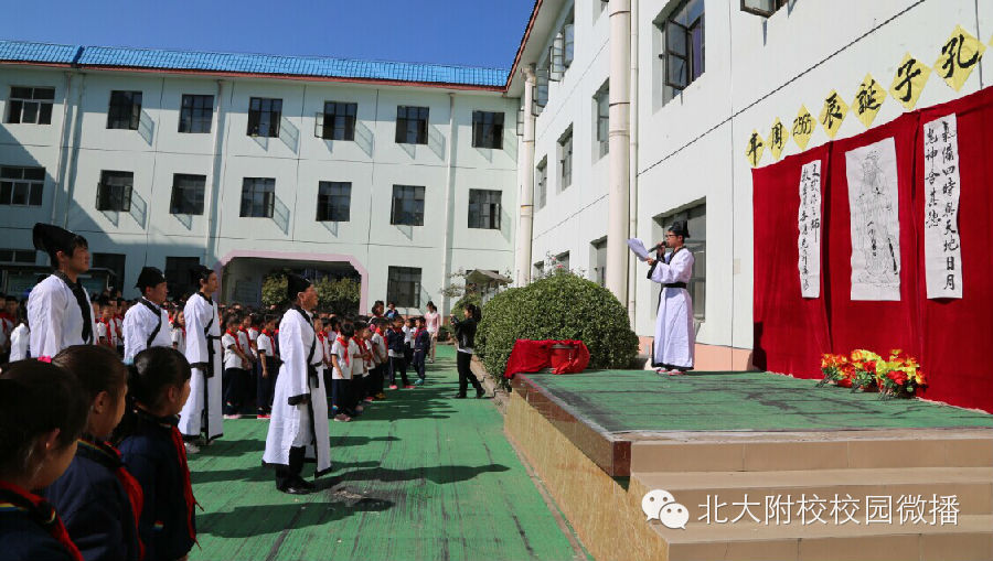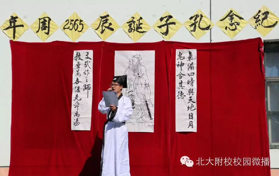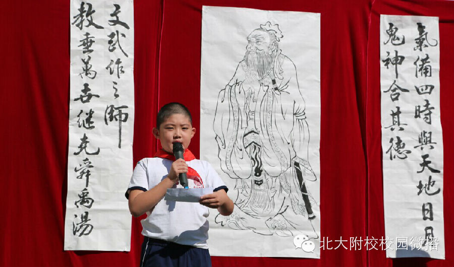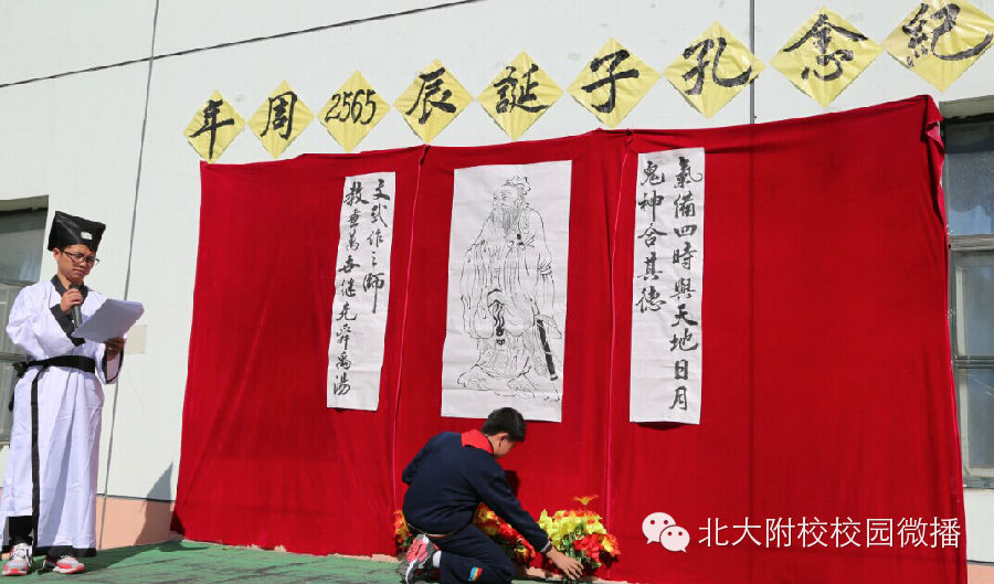 微讯(吴彩霞)2014年9月24日,国家主席习近平在纪念孔子诞辰2565周年国际学术研讨会暨国际儒学联合会第五届会员大会开幕会上发表了重要讲话。2014年9月27日,北大附属实验学校组织教职工认真学习领会习主席的讲话精神。今年9月28日,是孔子诞辰2565周年,北大附属实验学校举行了祭孔仪式。