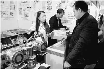 哈萨克斯坦商人在中国企业展台前了解打饼机情况。