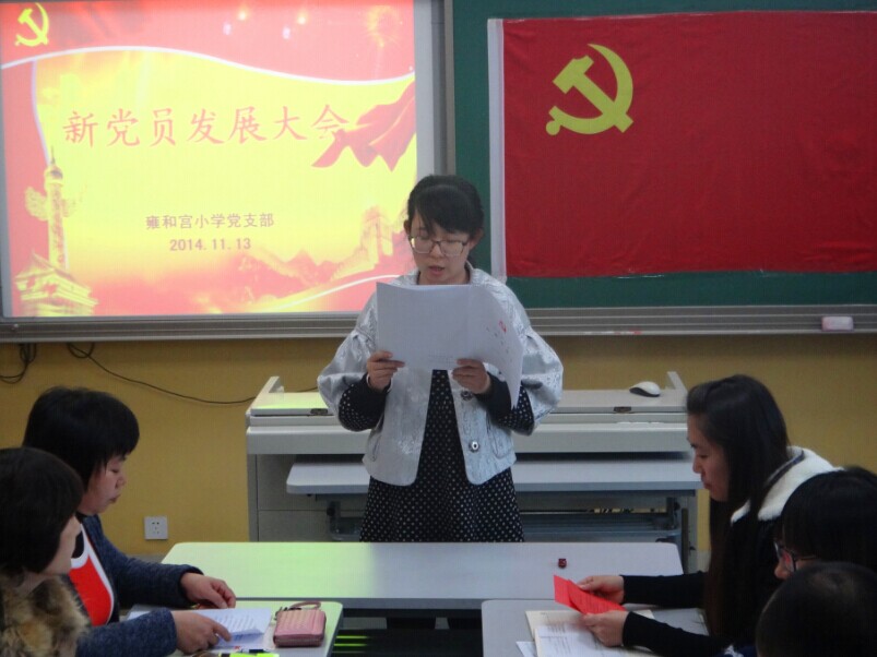 中国教育品牌网讯 2014年11月13日下午,雍和宫小学党支部隆重召开了新党员发展会。把优秀的教师吸引到党组织中,让党员成为优秀教师,是该校党支部提高教师队伍素质、纯洁党员队伍的有效途径。