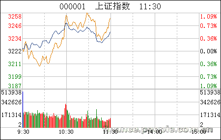 截至午间收盘,沪指涨30.47点,报3252.91点,涨幅0.95%,成交1532.96亿元;深成指涨41.02点,报11278.80点,涨幅0.37%,成交1112.94亿元;创业板跌5.69点,报1582.31点,跌幅0.36%,成交99.44亿元。