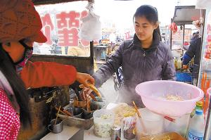 张俊芹做好了饼,王艺媛就赶快把饼拿到面前,开始娴熟地在饼上刷酱、裹菜、包装……这是14日中午,记者在张俊芹煎饼摊前看到的一幕。附近摊主说,这孩子特别懂事,每天六点半准时来帮妈妈出摊,中午放学后也要来。