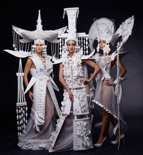来自圣彼得堡的科齐娜从蒙古传统服装中获得灵感,她研究了许多蒙古传统结婚礼服的老照片和图纸,利用普通白纸创造了一系列复杂却极度易损的结婚礼服。今天的蒙古结婚礼服多采用鲜艳大胆的颜色和图案,但科齐娜只用白纸,因为她认为颜色容易让人分散注意力。