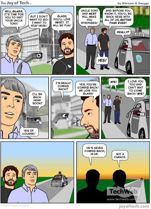 在离开谷歌实验室前夕,佩奇和布林对谷歌眼镜做了游说工作,称加入消费者产品部门之后,谷歌眼镜将引来人生的“第二春”(Better than ever。Nest will make you stronger)。