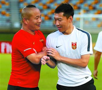 训练场上,国足翻译赵旭东(左)与队员“打情骂俏”。