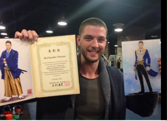 帕森斯因此获得日本WOWOW电视台所颁发的一张奖状,以及他身穿“王子装”和日本传统武士道服装的拟真画像,这位“高富帅”射手还开心与奖状合影。
