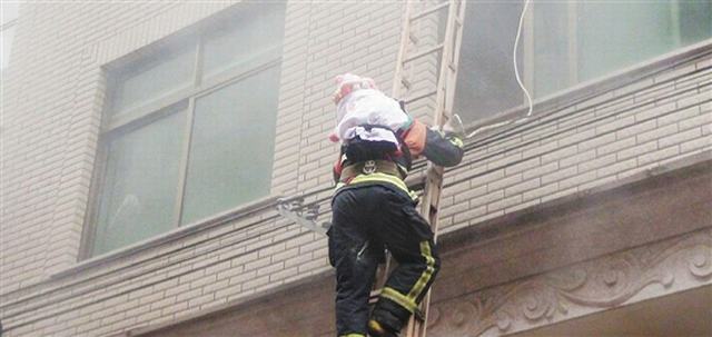 消防战士从梯子爬上3楼时,母亲抱着哭闹的宝宝,在烟雾越来越浓的房间里干着急。消防战士当机立断,把孩子绑在背上,一步步从梯子下到地面。最终,母子俩都被顺利救出。