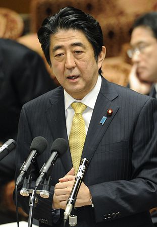 2月4日,日本首相安倍晋三在众议院预算委员会集中审议会议上回答民主党议员提问。