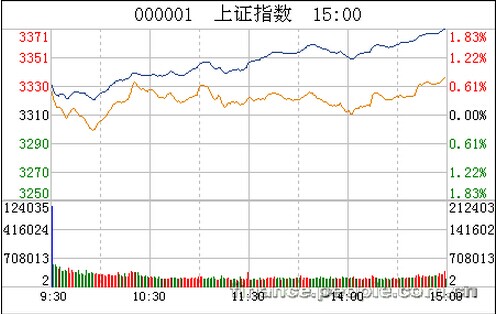 截至收盘,沪指涨25.98点,报3336.29点,涨幅0.78%,成交4102.60亿元;深成指涨126.33点,报11884.02点,涨幅1.07%,成交3875.89亿元;创业板涨58.94点,报1986.99点,大涨3.06%,成交445.60亿元。