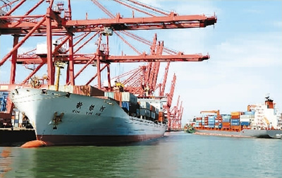 三月八日,江苏连云港港口码头装卸进出口货物呈现一派繁忙景象