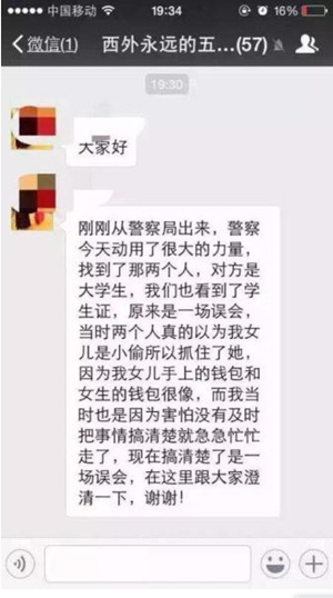 12日傍晚,大学城派出所通过微信朋友圈搜索以及视频监控回放、实地走访找到了双方当事人,并化解了误会。13日凌晨,上海市公安局松江分局官方微博“警民直通车-松江”发布辟谣微博,称该事件系误会,事情真相是孩子不慎撞到路过的学生,因孩子手里的钱包与学生相似,被学生误认为是小偷,拉住质问。该家长亦在微信群澄清了真相,称“原来是一场误会,对方是大学生,因为我女儿手上的钱包和大学生的钱包很像,误认为女儿是小偷”。